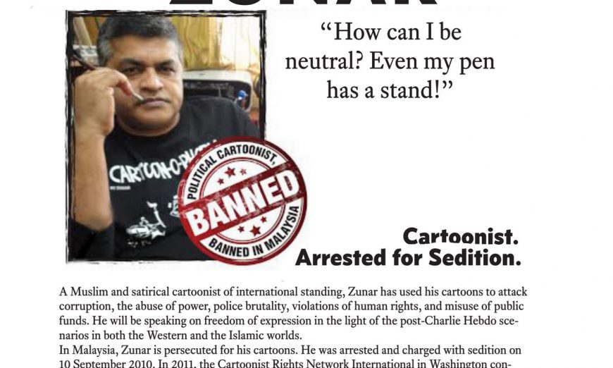 Cartoonist Zulkiflee Anwar Haque “Zunar”, faces a record-breaking nine charges under the Sedition Act for comments made on Twitter, and if convicted, could face up to 43 years imprisonment.
