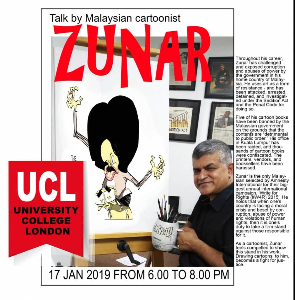 Zunar’s cartoon exhibition at Institute of Advanced Studies (IAS), University College London. “Laughter as a Political Tool – Zunar in Malaysia, an exhibition”