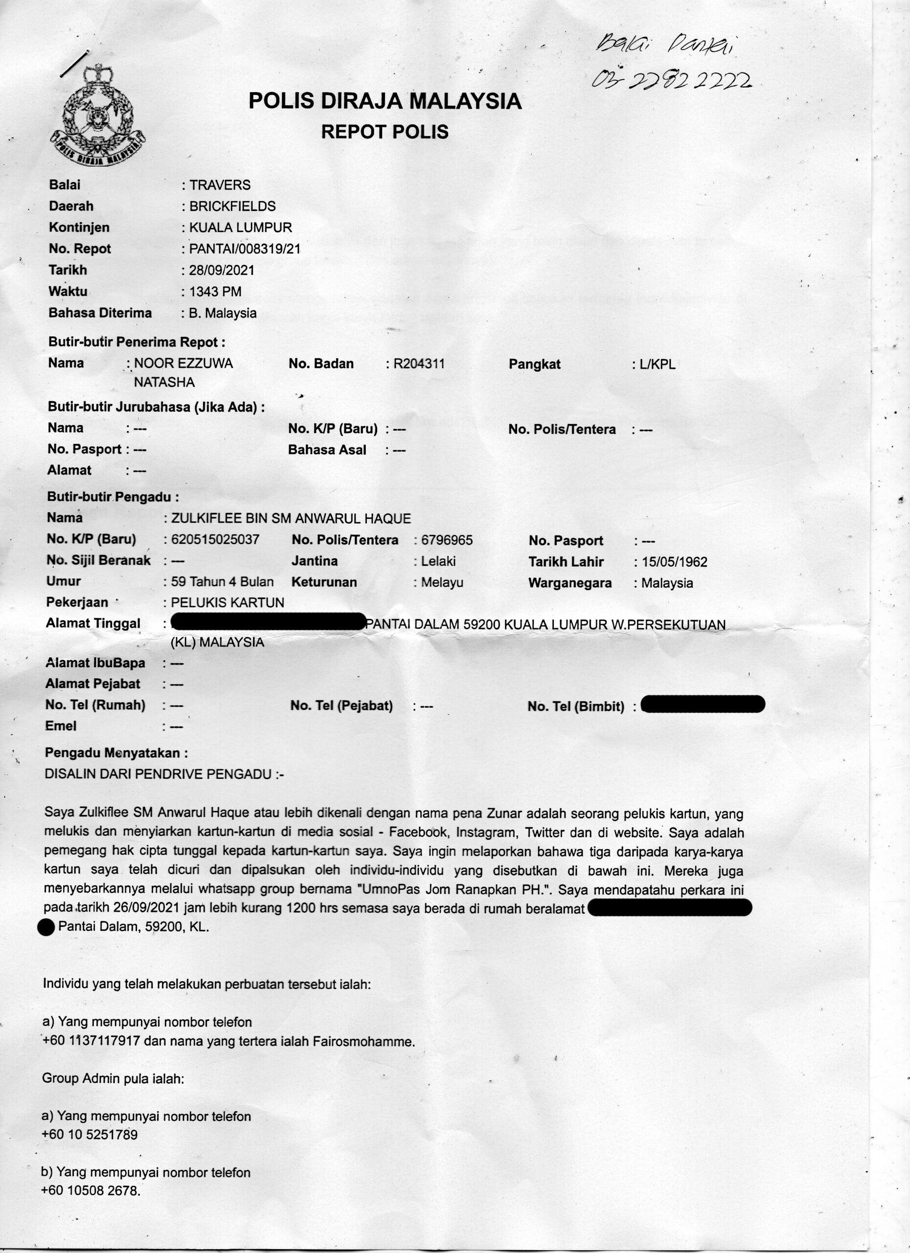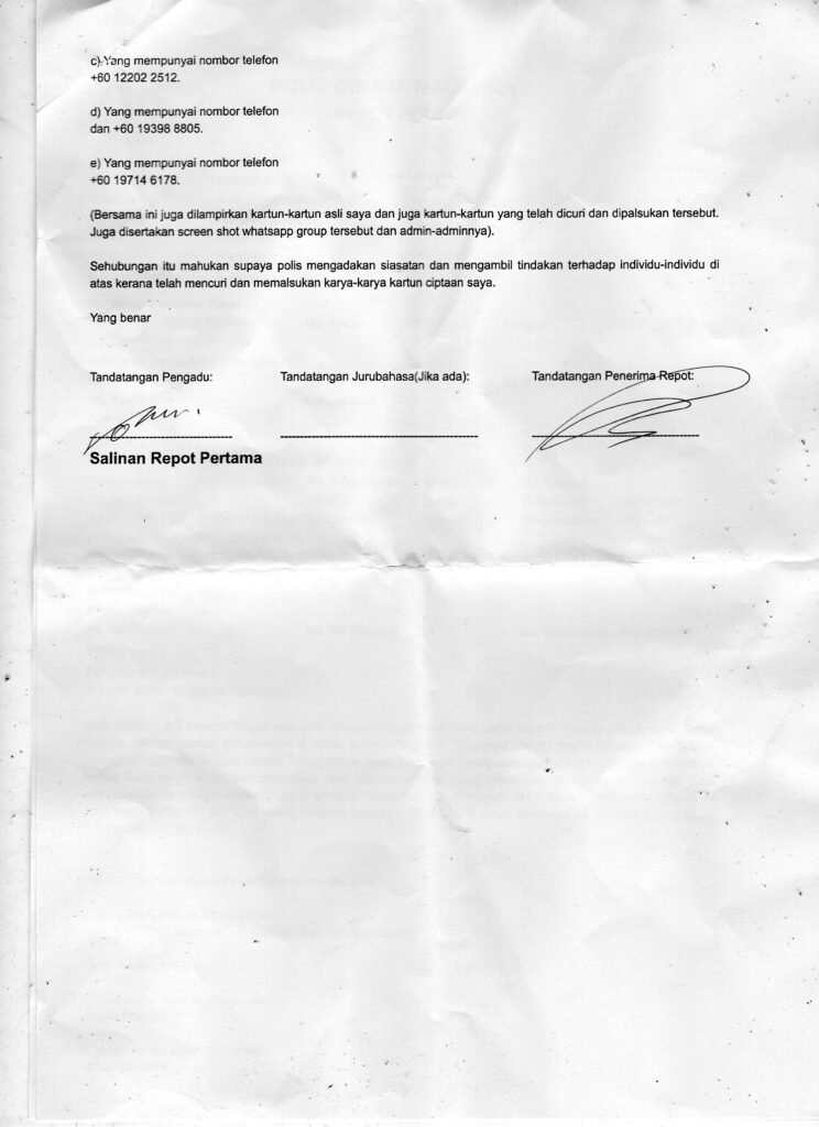 Today, I have filed a police report at Ibu Pejabat Daerah Polis Brickfield regarding the stealing and the forging of my cartoons. Report number PANTAI/008319/21