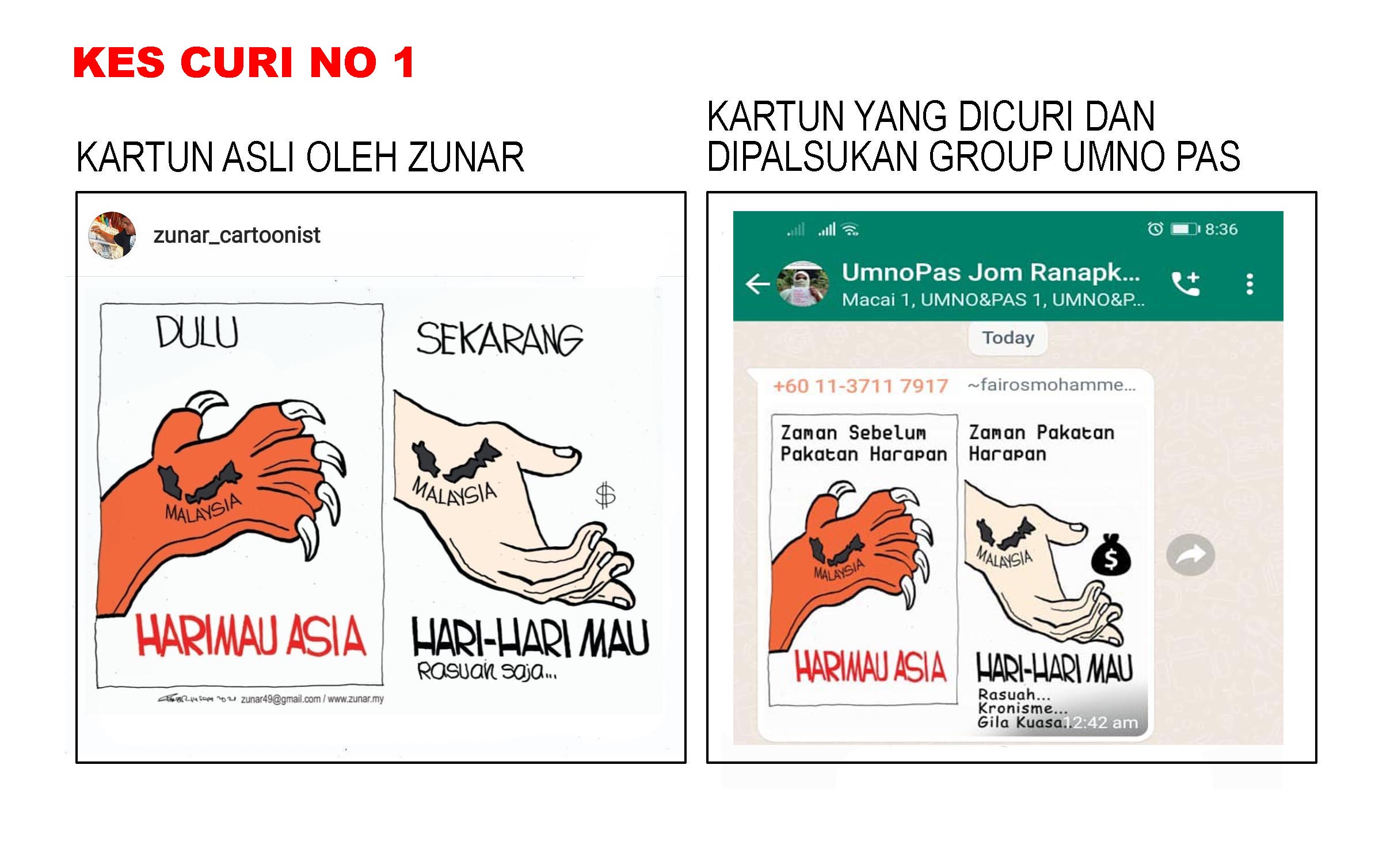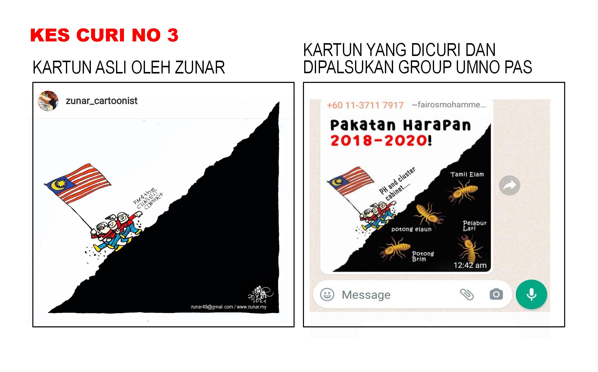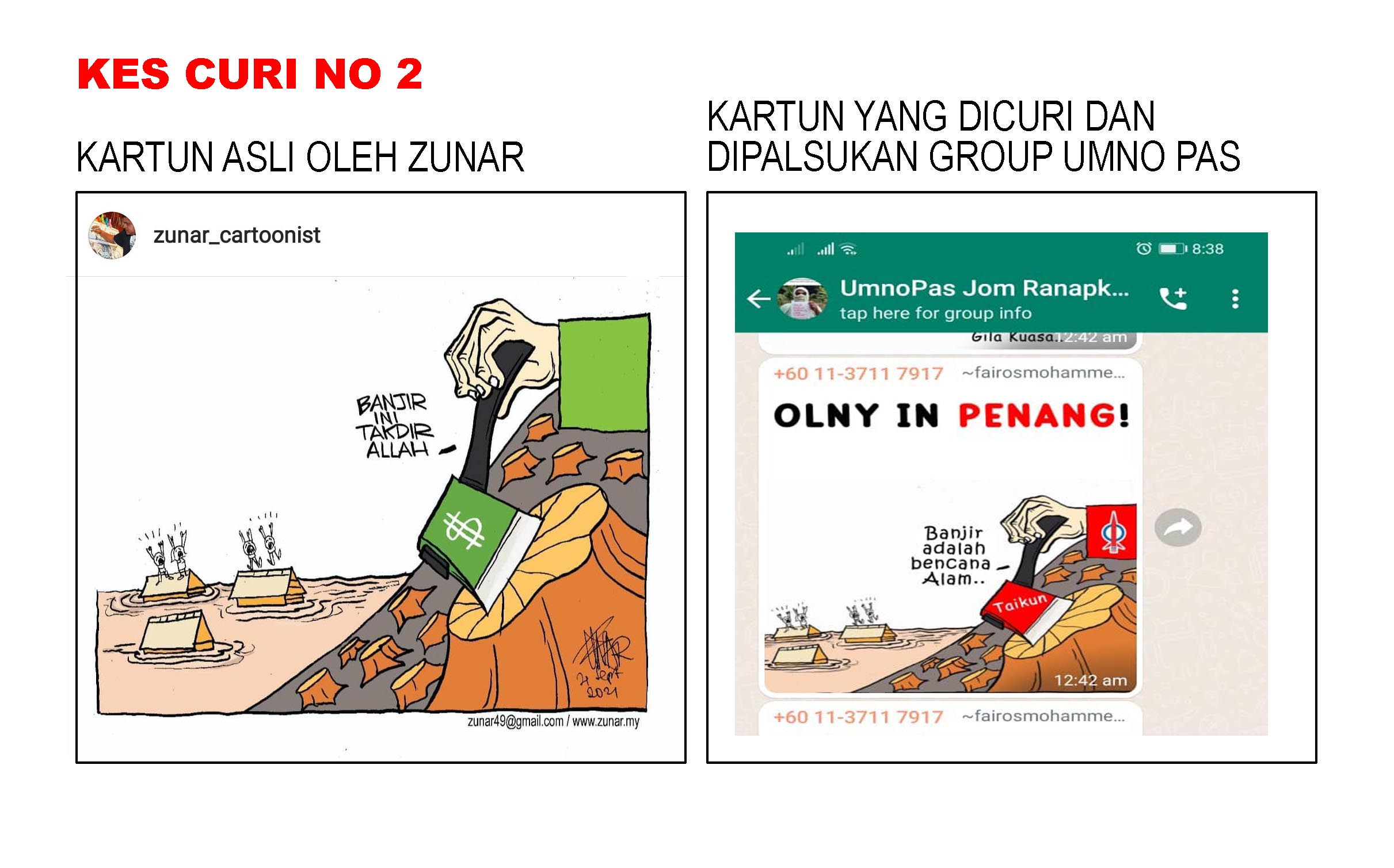 Di sini dilampirkan kartun-kartun asli saya, berserta dengan kartun-kartun yang telah diciplak serta screen shot butir-butir whatsapp group tersebut. (Media diberi kebenaran untuk menyiarkan foto-foto ini).