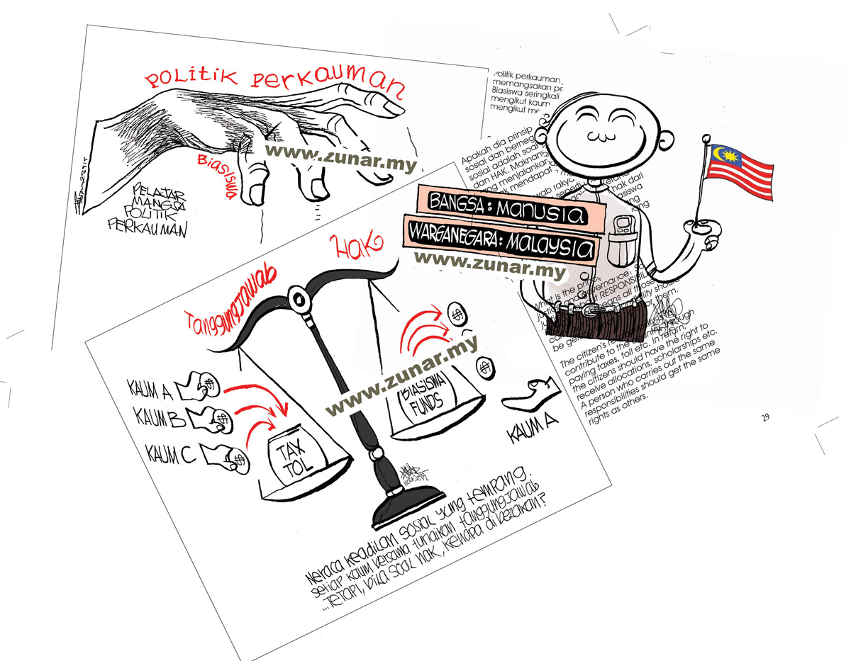 Kartun Anti Rasicm” (KAR) is published in two languages – Bahasa Melayu with English translations. KAR contains 48 cartoon illustrations with the harmony and anti-racial discrimination theme. It is part of my “Nation Rebuilding” mission.
